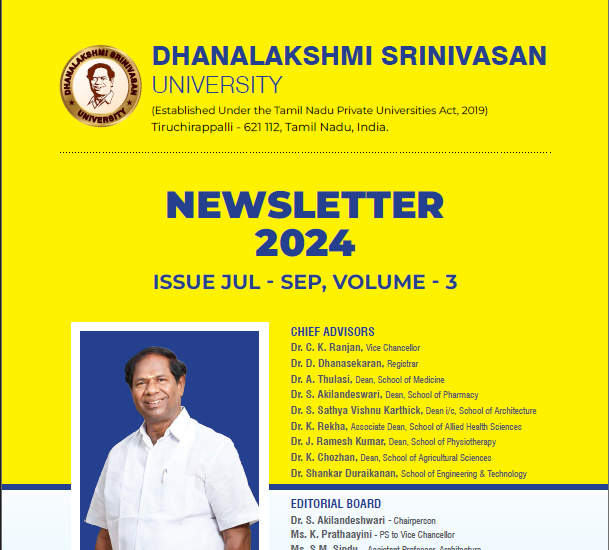 Dhanalakshmi Srinivasan University aims to inculcate values in the young minds and realise their potentials through education, an instrument to create a knowledge society. We provide conducive environment for students from various socio-economic and cultural backgrounds to become cognizant of their aspirations and dedicate themselves for the progress of the nation. To put the accent on the memorable happenings of our university, we come into sight with a Newsletter. My best wishes to the Newsletter team. Jai Hind!