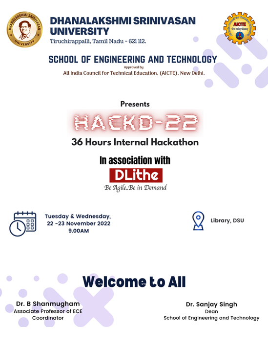 Helpline : +91 63841 76766 | 63841 76769Dhanalakshmi Srinivasan University, School of Engineering and Technology, Trichy is organized “HACKD-22” an idea hackathon programme in Association with DLithe Consultancy Services Pvt. Ltd., Bangalore with the theme “Think, Hack & Win the Glory”. Event finals coordinated on 22nd and 23rd November 2022. The motto of HACKD-22 is to ideate young minds for a better future. This programme allowed the SET students to think and expose their unique problem-solving talent. For the various problem statements, nearly 36 teams submitted their idea proposals, out of which 14 teams were shortlisted after the scrutinizing process to participate in the final event of 36 hours Hackathon. The winning team named Tomorrow is awarded a cash prize of Rs.6000 with a medal and the runner team named Tech Pirates received a cash prize of Rs.4000 with a medal. The remaining teams received the participation certificate.