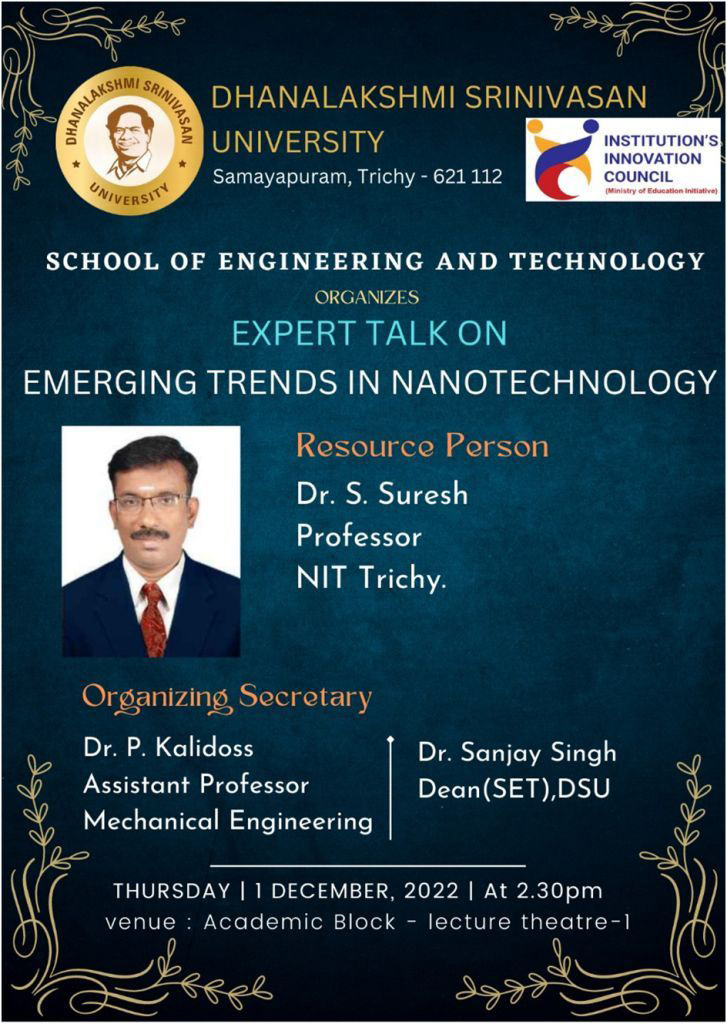 Dhanalakshmi Srinivasan University, School of Engineering and Technology organized a one day seminar on Emerging Trends in Nanotechnology on December 1st 2022 in Lecture theatre 1 . The seminar focused on different applications of nano structured hydrophobic and hydrophilic surfaces.The programme started at 03:00 pm with the welcome address by Dr. Sanjay Singh, Dean Schoo of Enginnering and Technology. The dignitaries on the dias is Dr. S. Suresh, Professor and Deputy Registrar, NIT Trichy. Achivements by the expert in the field of Nanotechnology. The paper titled “Experimental Investigation and theoretical determination of thermal conductivity and viscosity of Al2O3/Water Nanofluid” [Exp. Therm. Fluid Sci 34 (2) 210-216, 2010] is highly cited 150 times. The paper titled “Flow Boiling Heat Transfer Enhancement Using Carbon Nanotube Coatings” [Applied Thermal Engg. 65 (1), 166-175, 2014] has been downloaded or viewed 736 times. Paper published in the Journal of Mechanical Science and Technology titled “Heat transfer characteristics in latent heat storage system using paraffin wax”, has been selected for the JMST award for Most Cited Paper of Year 2014. The topic focus on the structure of a lotus leaf has a clever design that discourages surface wetting both through a waxy nonpolar coating and a rough structure which both make surface interactions less favorable, allowing water to bead up into spheres and easily roll off the leaf. He discussed about various applications of Nanofluids. A nanofluid is a fluid in which nanometer-sized particles, suspended in the base fluid, form a colloidal solution of nanoparticles in a base fluid. The nanoparticles used in nanofluids are typically made of metals, oxides, carbides, or carbon nanotubes, while the base fluids include water, ethylene glycol, and other heat transfer fluids. The vote of thanks is proposed by Dr. P. Kalidoss, Assistant Professor, Department of Mechanical Engineering, School of Engineering and Technology.