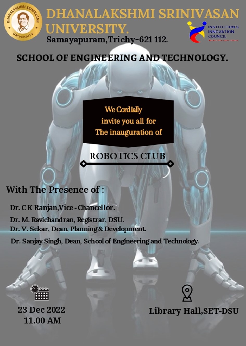 The Dhanalakshmi Srinivasan University, School of Engineering and Technology's Robotics Club was created with the objective of bringing students together in a learning environment and providing them with a venue to foster their interest in robotics. The club teaches countless number of interpersonal skills vital in daily life, from team-building to cooperation, from perseverance to sincerity. The club offers much more than only technical improvement to its members.
