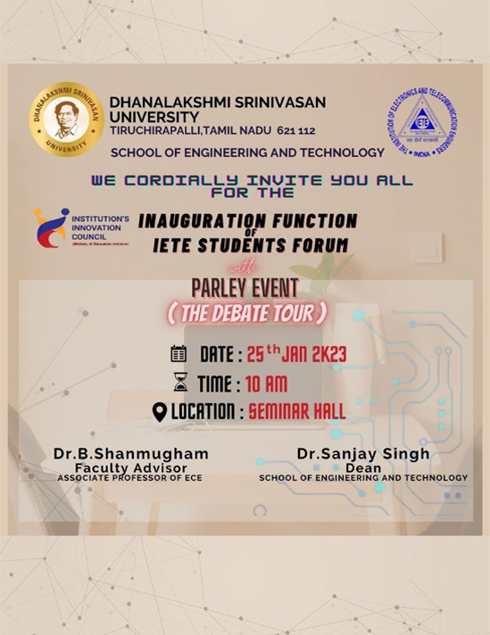 The splendour inauguration ceremony of IETE Students Forum had been conducted in Dhanalakshmi Srinivasan University, School of Engineering and Technology on 25th January 2023. The function had been commenced with TamizhthaiVazhthu and the welcome address speech by the honourable forum President Mr.R.AjayVarsan from AIDS department to recept the chief guest Dr.Rekha,Dept of psychology (officiating Dean), Paramedical Sciences, DSU, the higher officials, the faculties and the student members . Following that our meritorious Dean, Dr.Sanjay Singh had delivered the felicitation address and a few beneficial oration of the credits and merits of being involved in such forums. He added that it’s a privilege to have this kind of venturing and skill evolving activities on practice and the council members had inferred their role. Followed by that parley events – a debate show was also conducted with the rekindling topics with the participation of 3 teams. Amongst that 3rd team which debated for “which one is right for a good career path, starting a own start up or joining the existing firm” was selected as the finely presented team and the team members : Sri Swaroop kumar, Sai Deep, Jaswanth Reddy together from AIDS department were applauded by the noble chief guest Dr.Rekha. The function was concluded with the grateful vote of thanks to the guests, the faculties, the participants and the audience with patriotic National Anthem.