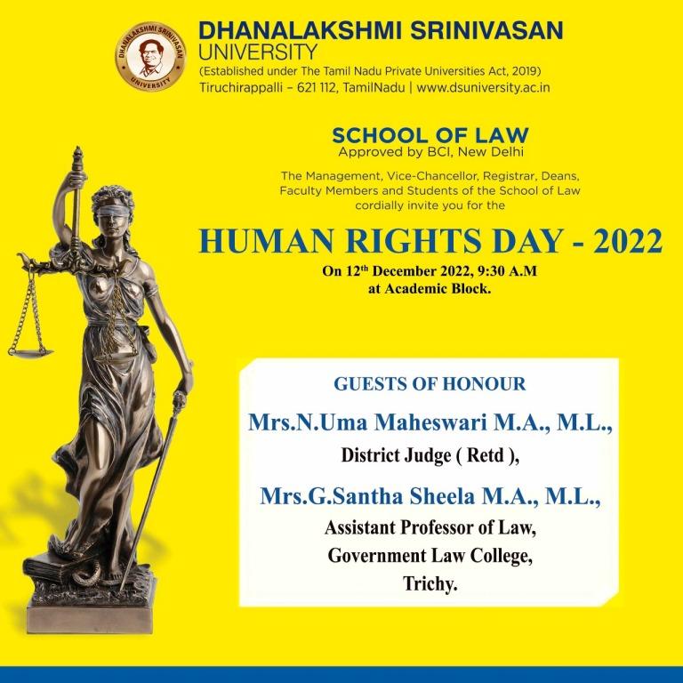 Helpline : +91 63841 76766 | 63841 76769In commemoration of Human Rights Day on 10th December, a programme on Human Rights was held on 12th December, 2022 from 10 am to 12.00 pm, by the Department of School of Law in Dhanalakshmi Srinivasan Universtiy, Trichy campus. The Poster Presentation Competition was held on 8th Nov, 2022 for the students of School of law. On 12thDecember the programme started with Thamizh Thai Vazhthu. The welcome address was given by Mr. P. Ragu Balan, Assistant Professor of Law and the introduction of speakers by Mrs. J.JANANI, Assistant Professor of Law and Mrs. M. Suriya Priya, Assistant Professor of Law. Our Honorable Vice Chancellor honored the guest and Dean of Planning and Development felicitated the gathering The first guest speaker Mrs. N. Uma Maheshwari, District Judge (Retd.), Karur has enlightened our students with "Over view of Human Rights". After the tea break, the next session with second guest speaker Mrs. G. Santha Sheela, Assistant Professor of Law, Government Law College, Trichy delivered a speech on the topic "Importance of Universal Declaration of Human Rights". Prizes were distributed by the Guests. Vote of thanks was given by Mrs. M. Abinaya, Assistant Professor of law, Dhanalakshmi Srinivasan University. The programme was successfully ended with National Anthem.