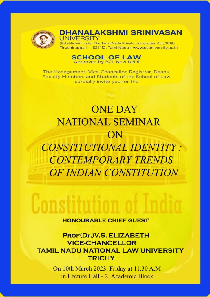 One day National seminar on “CONSTITUTIONAL IDENTITY : CONTEMPORARY TRENDS OF INDIAN CONSTITUTION” was organized by School of Law, in Lecture Hall II , Academic Block, Dhanalakshmi Srinivasan University, Tiruchirappalli -112 on 10 th March , 2023 from 11.30 am to 4.30 pm. The Seminar was started with Tamil Thai valthu by the students. The Dignitaries lit the lamp and started this program. The session start with welcome address by Dr.E.Venugopal, Dean ,School of Law, welcomed all the dignitaries, presenters and all present in the programme with a brief introduction of the Constitution and about the keynote speaker Prof.(Dr).V.S.Elizabeth,Vice Chancellor,TNNLU,Trichy.The chief guests were felicitated by DR.M.Ravichandran,Registrar,DSU. He addressed the student about the importance of Constitution and should be followed by every country. Mrs.J.Janani, Assistant Professor, School of Law, introduced the Chief Guest.Prof(Dr.)V.S.Elizabeth,Vice Chancellor,TNNLU,Trichy delivered the keynote speech pointing out that our India is young crossed 75 years old .She stressed that few changes can be made in the Constitution and compare the past constitution and present constitution Article in our Indian country.She highlighted about PREAMBLE and said that the needs of the people change but the basic structure of Human Rights should not be changed. Finally she concluded speech that every citizen should be awareness about the Constitution.