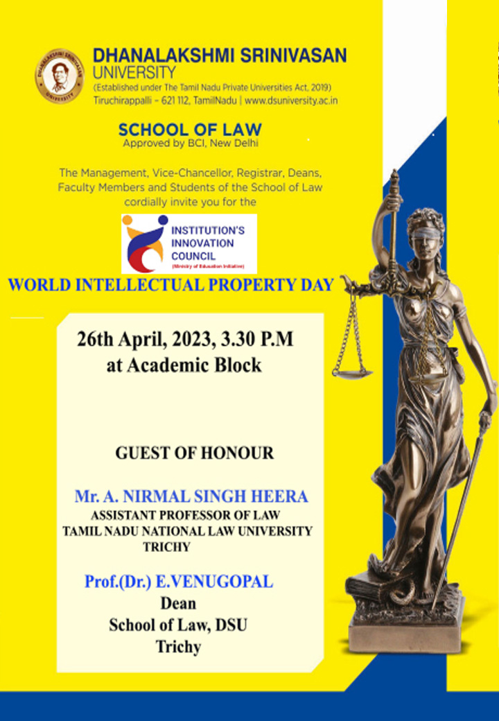 The School of Law, Dhanalakshmi Srinivasan University, celebrated the World Intellectual Property Day on April 26, 2023. Guest Lecture Mr. A. Nirmal Singh Heera, Assistant Professor of Law, Tamil Nadu National Law University, Trichy was invited as the Guest of Honour at 3.30 p.m, Academic Block. Prof.(Dr.).E. Venugopal, Dean, School of Law welcomed the gathering and Vetrivel Punithan of I BBA LLB(Hons.) Introduced the speaker Mr. A. Nirmal Singh Heera, Assistant Professor of Law, Tamil Nadu National Law University. The resource person started the session on the basic concepts of Intellectual Property Rights. “Intellectual property” are type of property that results from creation of the human mind, the intellect and introduced different rights,UDHR 1948,IP contribution towards Economic nation and Patent right. He instructs the day is celebrated to make students to know how Intellectual property (IP) rights encourage innovation and creativity. This year World IP Day puts innovation and supports the efforts to create a green future. He highlights few examples on Intellectual Property and mentioned that India is mostly lack in IPR education, lack of interests amongst Industries to encourage R& D and lack of motivation to encourage commercialization of inventions that’s a major bottleneck in commercialization and Technology transfer.