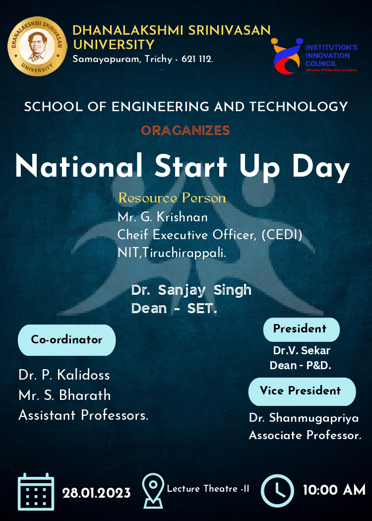 The National Start-up day was celebrated on 28.01.2023 at Lecture Theater-II, DSU. The event was inaugurated with an auspicious note of Thamizh Thai Vazhthu at 10.30 am for the Second Year B. Tech. students. Around 80 engineering stream students actively participated in the program.