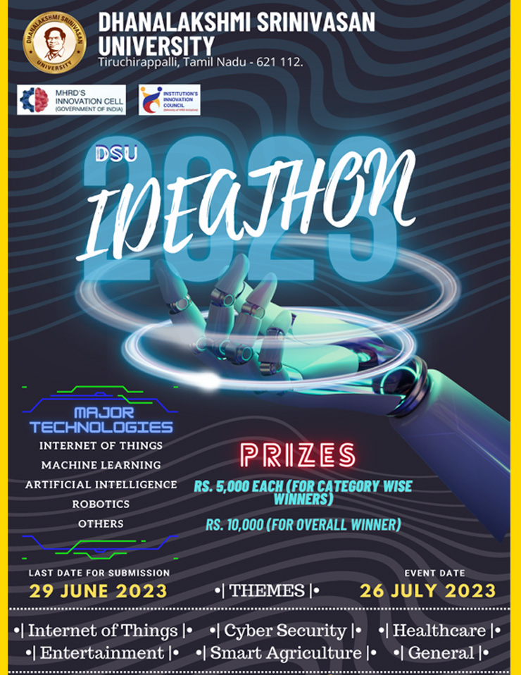 The Ideathon 2023event was planned by Institution Innovation Council (IIC), Dhanalakshmi Srinivasan University, Samayapuram, Trichy – 621 112 and its final event held on 26th July 2023 (Wednesday).