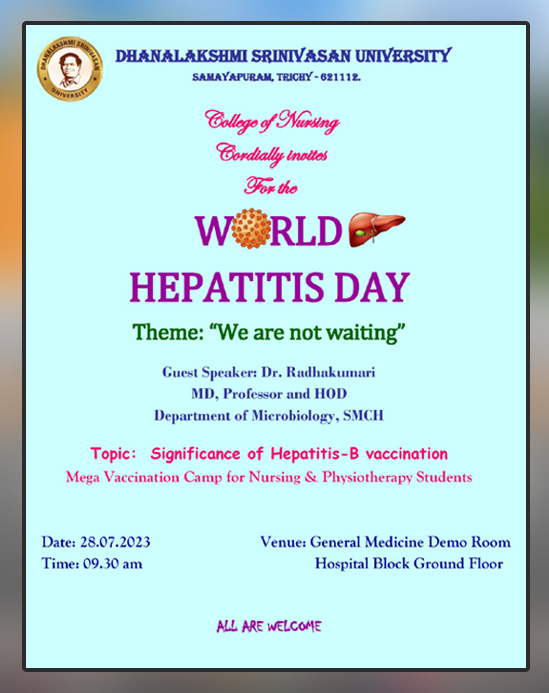 In conclusion, the function related to world Hepatitis day organized by Dhanalakshmi Srinivasan University, college of Nursing, Trichy was great step towards promoting sustainable practice and creating awareness about the importance of Hepatitis vaccine. The presence of esteemed dignitaries and the active participation of students. The university hopes to continue its effort promoting sustainable practice and contributing to a hepatitis free future. During the day of event nearly about 350 students have taken vaccination as role model for the public.