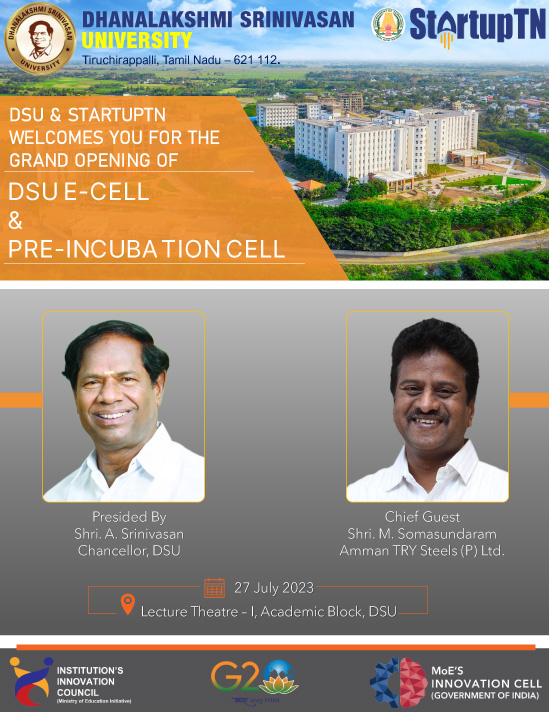 On July 27, 2023, Mr. M. Somasundaram, the Managing Director of AMMAN TRY Steels Group, inaugurated the entrepreneurship cell and pre-incubation cell at Dhanalakshmi Srinivasan University. In his inaugural address, he emphasized the importance of stepping out of one's comfort zone and creating opportunities for oneself. He shared real examples from his own entrepreneurial journey, including how he conceived the concept of AMMAN TRY and the challenges he faced in a less technologically advanced era. Mr. Somasundaram highlighted the value of being the first to execute an idea, as it can provide a competitive edge.