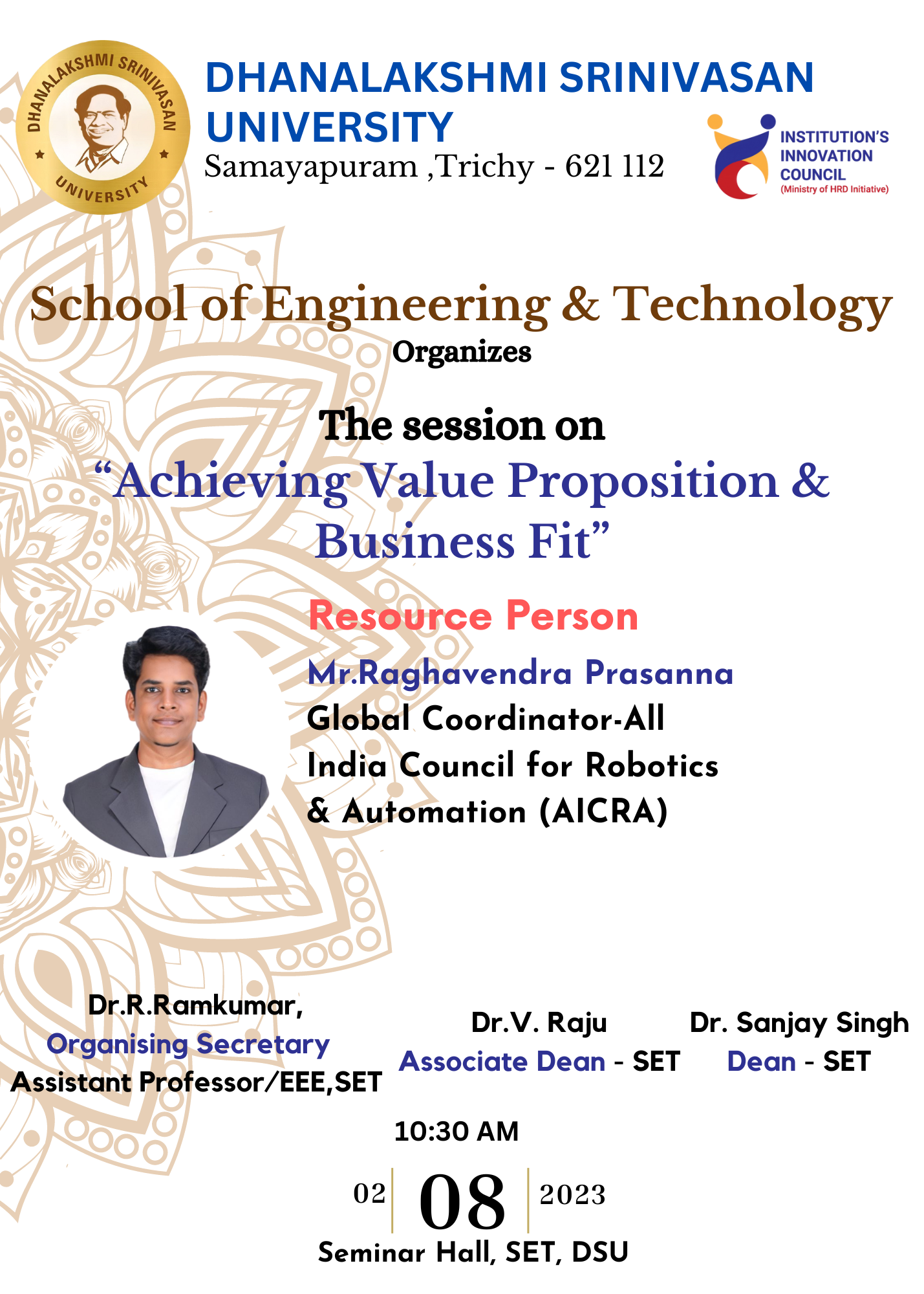 Dhanalakshmi Srinivasan University, School of Engineering and Technology organizedthe session on "Achieving Value Proposition & Business Fit" on 02nd August 2023 in 2nd Floor Seminar Hall, DSU. The welcome address by Dr. Sanjay Singh, Dean School of Engineering and Technology. The dignitaries on the dais is Mr. Raghavendra Prasanna, Global Coordinator-All India Council for Robotics & Automation (AICRA), Puducherry.