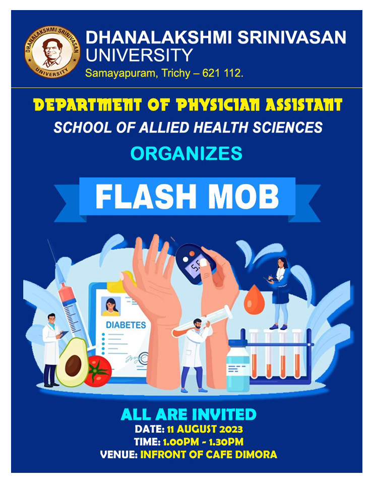Department of Physician Assistant representing the School of Allied health sciences conducted a FLASH MOB in view of creating awareness about "Organ Donation" on 11th Aug 2023, Friday near our hospital entrance,between 1.00pm - 1.30pm in lieu of Organ Donation Day (August 13,Sunday).The event started in the presence of our VC sir Dr. C K Ranjan , Dr. V. Sekar Officiating Registrar , Dr.Thulasi Dean of SMCH, Dr. Rekha, Associate Dean AHS, Dr. Sanjay singh, Dean School of Engineering. Viewers of the program were students from various schools, Patients & Patient attenders.