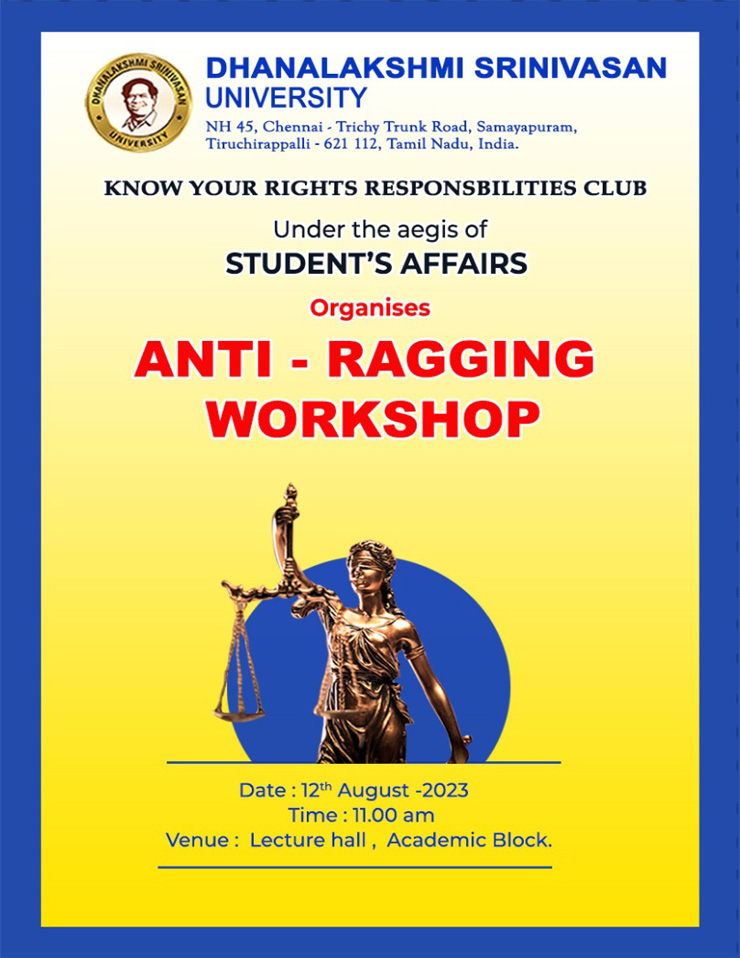 The School of Law, Dhanalakshmi Srinivasan University,Know your Rights Responsibilities Club under the aegis of Student's Affairs organized Anti – Ragging Workshop on 12th August 2023 at 11.00.am, Lecture Hall, Academic Block.The session started with Tamil thai valthu by School of Law students and lighted the lamp by dignitaries on the stage. Mr. P. Ragu Balan, Assistant Professor, School of Law welcomed the gathering and Mrs.M.Abinaya, Assistant Professor; School of law introduced the speaker Dr. B. Kumaresan, Assistant Professor, Tamilnadu National Law University, Trichy. Dr. M. Ravichandran, Dean, School of Agriculture Sciences, DSU, honored the Guest. The resource person addressed the students impressing upon them adverse effects of ragging. He explained to the students about ragging and its criminal offence and the person is liable to be prosecuted for it. Not only the offending parties, but also the silent witness would be held equally responsible. He explained to the first years, to protect the juniors, they should not be misused by them as it could destroy someone's career.The next session started at 2.00 p.m. Mrs. M. Suriya Priya, Assistant Professor, School of Law introduced the resource person Dr. V. Shyam Sundar, Assistant Professorof Law, Dr. Ambedkar Government Law College, Pudupakkam. He started the session by quoting the first Anti ragging case Pon Navarasu vs John David in 1996 and followed by other anti ragging cases. He insist many anti ragging may cause depression to the students and sometimes they decide to suicide as it affects their family. He highlighted about Anti ragging squad and Committee plays an important role to reduce Anti ragging issues. He has given mail-id and helpline number for reporting Anti ragging complaint. Ragging is prohibit in all Institutions and every students should follow the rules and regulations of the institutions to avoid Anti ragging. The speaker explained all the aspects with the help of PPT and explained duties and responsibilities of Anti-Ragging squad and Committees to monitor anti ragging issues in the Institutions. The lecture was followed by a question-answer session where the students were given an opportunity to pose questions based on the topic. Dr. D. Jothivenkatsan, Associate Professor, School of Law proposed a vote of thanks. The lecture was very well received by the various schools from Dhanalakshmi Srinivasan University. Nearly 250 students actively participated and benefited the fruitful session.