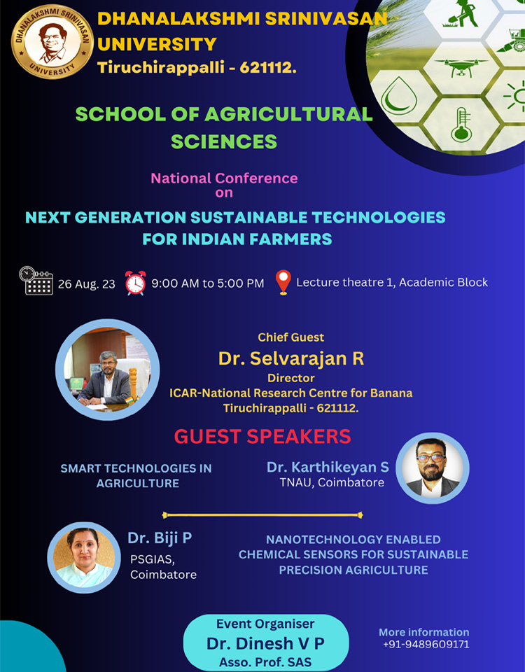 Then the chief guest Dean, School of Agricultural sciences, Dr. M. Ravichandran delivered the inaugural address by emphasizing the importance of the next generation sustainable technologies in agriculture. Followed by the vote of thanks by Dr. V. P. Dinesh, Associate professor, SAS, DSU.