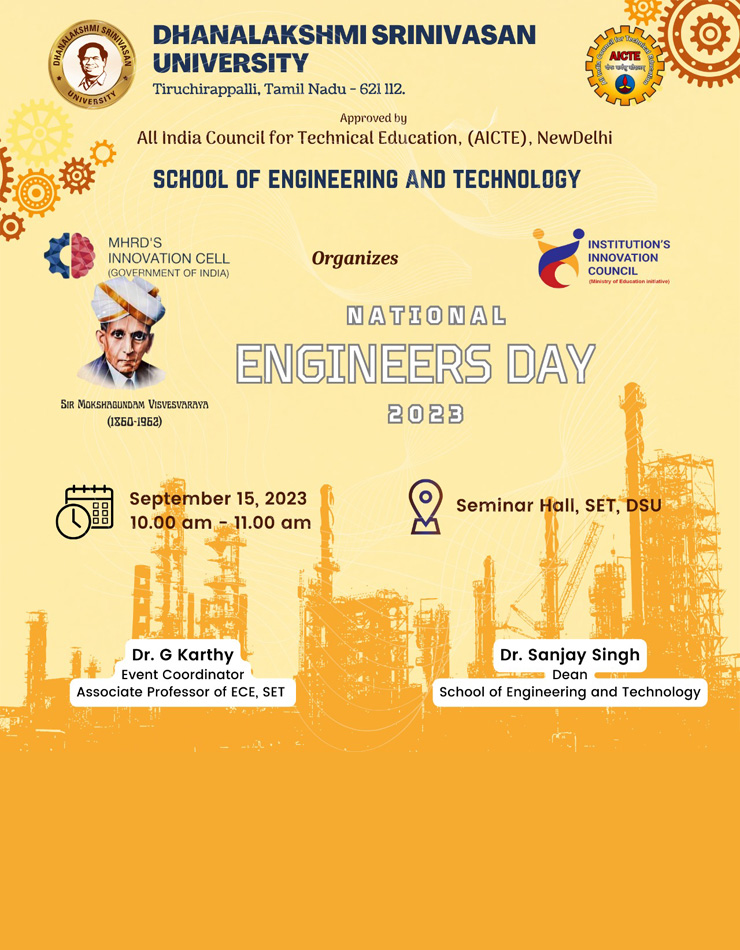 The National Engineers Day - 2023 was celebrated on 15th September 2023 by School of Engineering and Technology (SET) of Dhanalakshmi Srinivasan University (DSU) at Seminar Hall, SET. Our Honourable Dr. C. K. Ranjan, Vice-Chancellor and Dr. V. Sekar, Registrar Incharge and Dean Planning and Development presided over the function. Dr. N. Prakash Controller of Examinations and Dr. K. Rekha Associate Dean of AHS were also graced the occasion. 940 Students were present in the blended mode (both offline as well as online) and 57 SET staff also attended the event.