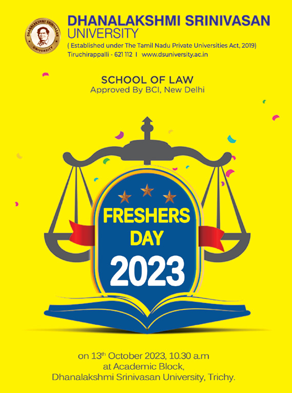 The School of Law, Dhanlakshmi Srinivasan University, conducted an inaugration function for first year students on 13.10.2023 at 10:30 a.m, 6th Floor-Lecture Hall, Academic Block. The Programme started with Tamilthai vazhthu by School of Law students. Mr.P.Ragu balan, Dean in-charge, School of Law welcomed the gathering and Mrs. J. Janani, Assistant Professor, School of Law introduced the chief guest Dr. A. Thiyagarajan, Senior Advocate, Madras High Court, Chennai. Dr. C.K. Ranjan, Vice-Chancellor, Dhanalakshmi Srinivasan University honoured the Chief guest. The Chief guest started the session by welcoming the students and addressed the importance of law and how the court works in the case. Then, he guided the students for their future with his virtue and experience. Vice-chancellor welcomed the students and introduced them to the Dhanalakshmi Srinivasan University. Finally, Dr. U. Vijaya shankar thanked the Chief guest, Vice-Chancellor and students.