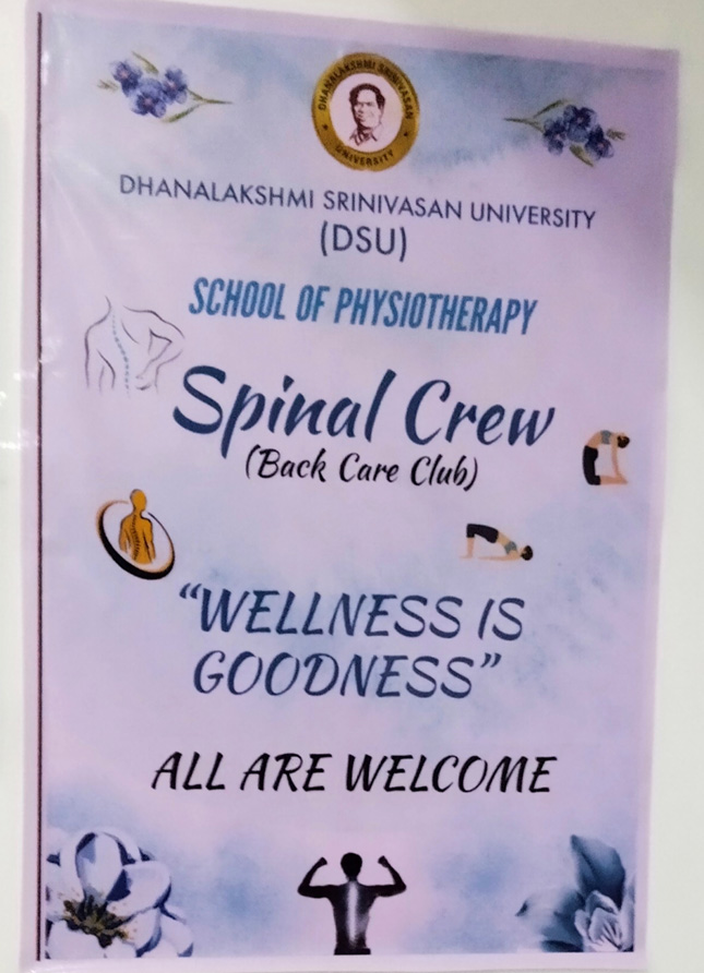 On the 13th May 2023, the School Of Physiotherapy organized an Inauguration Function for the two school clubs (i) Back care club - Spinal Crew & (ii) Stress Free Club - Wellness Nest, Under the Guidance Dr. N.N. Bobby HOD. The Chief guest for the function was Prof. A. Pechiammal Dean Paramedical Sciences.