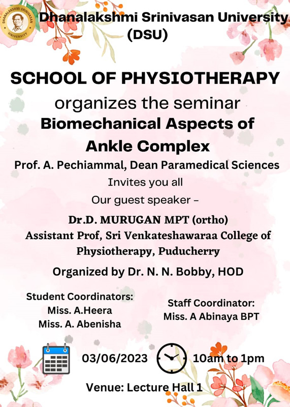 Dhanalakshmi Srinivasan University. School of Physiotherapy Organized a Seminar on 3rd June 2023 Under the Guidance of Dr. N.N. Bobby HOD on the topic "Bio Mechanical Aspects of Ankle Complex".