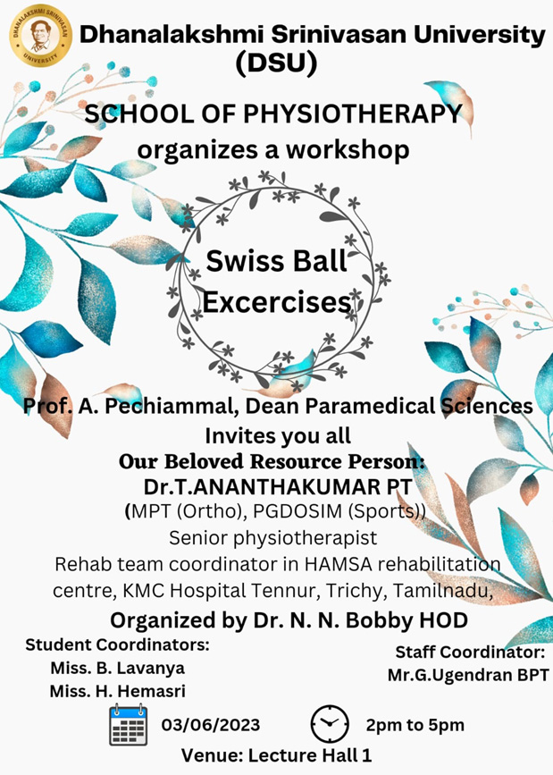 Dhanalakshmi Srinivasan University School of Physio Therapy Oraganized a Workshop on 3rd June 2023, Under the Guidance of Dr. N.N. Bobby HOD on the Topic "Swiss Ball Exercises".