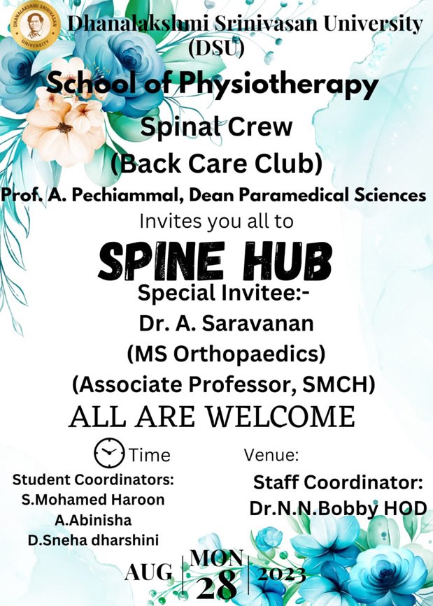 On 30th August 2023, School of Physiotherapy Back Care Club "Spinal Crew" conducted the Spinal Hub event as a awareness program about Ergonomics and common postural Mistakes , organized by II year BPT Students.