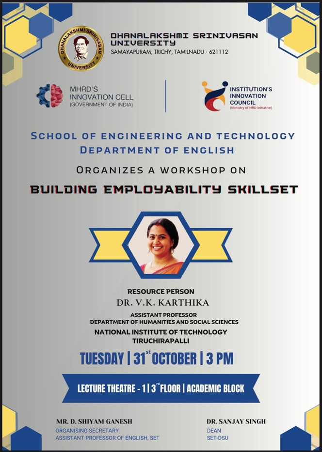 The workshop on "Building Employability Skillset" was held on 31st October 2023, organized by the Department of English, School of Engineering and Technology, Dhanalakshmi Srinivasan University, Tiruchirappalli. The main objective of the workshop is to enhance the knowledge of the students about the various employability opportunities and develop the right skills to use the opportunities. Dr. V.K. Karthika, Assistant Professor, Department of Humanities and Social Sciences, National Institute of Technology, Tiruchirappalli, was invited as the guest speaker for the workshop.