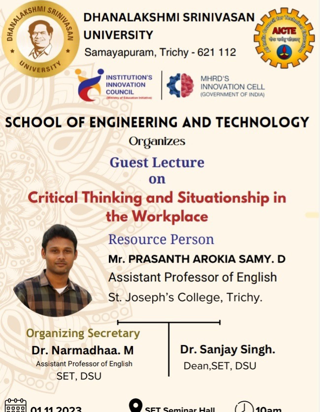 In School of Engineering and Technology, Department of English organized a guest lecture on "Critical Thinking and Situationship in the Workplace" on 01.11.2023. Resource Person, Mr. D. Prasanth Arocikasamy Assistant Professor, Department of English, St. Joseph's College, Trichy presented the importance of Critical Thinking and how to handle the situation in the workplace and made the students to actively participate in the lecture.