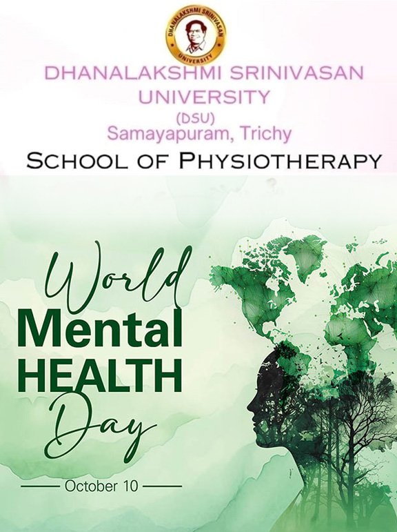 Dhanalakshmi Srinivasan University, School of Physiotherapy, Stress free club "Wellness Nest" organized a program World Mental Health Day held on 10th Oct 2023. The special Invitees for the program was Dr. K. Tharmar Director Of Physical Education And Prof.A. Pechiammal, Dean of Paramedical science. The program venue ENT demo room, 3rd floor, Hospital Block.