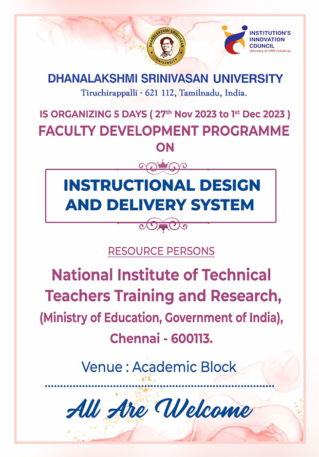 An invited training session was organized on "Instructional Design and Delivery System" for five days from 27.11.2023 to 01.12.2023 in DHANALAKSHMI SRINIVASAN UNIVERSITY, SAMAYAPURAM Campus.