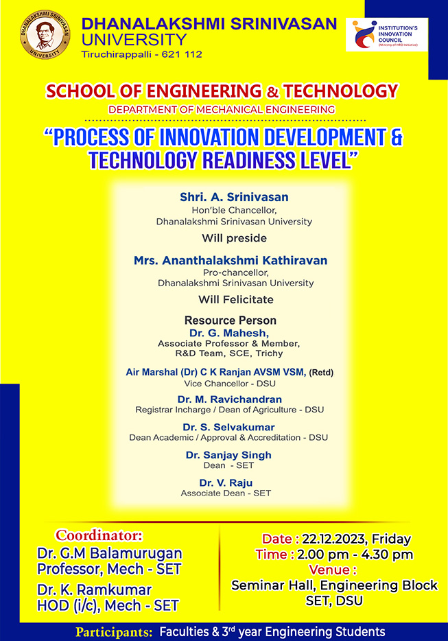 Innovation Program Organized by the Department of Mechanical Engineering under IIC about "Process of Innovation Development / Technology Readiness Level" for all the faculties of School of Engineering & Technology and students of third year on 22, December 2023 from 2.00 to 4.30 PM. This programme was led by Dr. G. Mahesh, Associate Professor / Member, R&D Team, Department of Mechanical Engineering, Saranathan College of Engineering, Trichy. The resource person indicated the students with the simple innovation ideas for their project and patent registration. Also he explained the expectation of the industry and briefs the earnings from the innovation ideas. He shared the importance of patent by getting the job in core industries and usage of various forms for patent registration. This seminar session aimed to provide awareness to the students and faculties about the need of innovation ideas and mindset for the current scenario and challenges. Around 200 students of third year of all branches and one section from first year of Engineering and Technology (A7 Batch) and 10 faculties were actively participated in this programme. Dr. Sanjay Singh, Dean, School of Engineering and Technology, Dr. V. Raju, Associate Dean, School of Engineering and Technology, Dr. K. Ramkumar, HoD of Mechanical and Dr. G. M. Balamurugan, Professor of Mechanical was present.