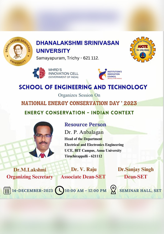 The National Energy Conservation Day (NECD)' 2023 celebration was organized by School of Engineering and Technology, Dhanalakshmi Srinivasan University, Samayapuram, Trichy - 621 112 in association with Institution’s Innovation Council (IIC) on 14.12.23 (Thursday). The participants were from School of Engineering and Technology. This NEC Day celebration started up with THAMIZH THAI VAZHTHU, followed by Dr. C. Suresh, Professor, Department of EEE, School of Engineering and Technology has delivered his welcome address and felicitation by Dr. V. Raju, Associate Dean, School of Engineering and Technology, Dhanalakshmi Srinivasan University, Tiruchirappalli.