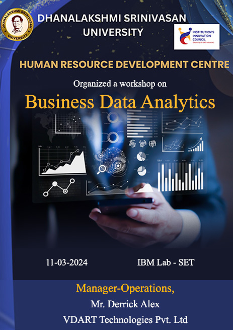 Human Resource Development Centre organized a workshop on Business Data Analytics on 11-03-2024, @IBM Lab, SET. Mr Derrick Alex, Manager-Operations, VDART Technologies Pvt. Ltd.