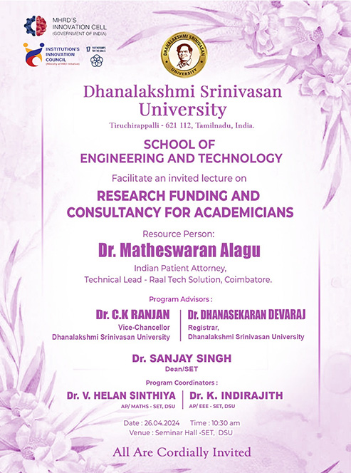 The School of Engineering and Technology recently hosted an enlightening invited talk titled "Research Funding and Consultancy for Academicians" Dr. Matheshwaran Alagu, an Indian patent attorney and Technical Lead at Raal Tech Solution in Coimbatore, delivered an engaging lecture that left a lasting impact.