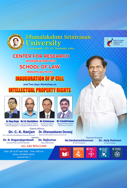 The inauguration of the IP Cell and the two-day workshop on "Intellectual Property Rights," organized by the Centre for Research in association with the School of Law at Dhanalakshmi Srinivasan University, on April 26th and 27th, 2024, to mark "World Intellectual Property Day," was a resounding success. Attendees gained invaluable insights into patent drafting, copyright, and patent application processes, thanks to expert speakers from esteemed institutions. Interactive discussions facilitated knowledge sharing and a deeper understanding of IP concepts and their applications in academia and industry.
