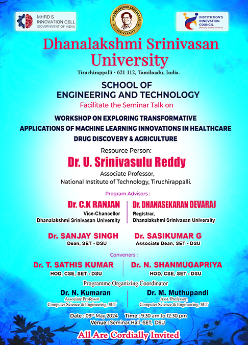 Department of computer science and engineering organized workshop on Exploring Transformative Applications of ML innovations in Healthcare, Drug Discovery and Agriculture 9th May 2024 during 10.00am to 12.30 noon. Resource person Dr. U Srinivasulu Reddy, associate professor, department of computer application at National Institute of Technology, Tiruchirappalli. Prof. Dr. U. Srinivasulu Reddy explained about basics of Machine learning, Deep Learning, Computer Vision and Artificial Intelligence in addition with applications of Machine Learning and Deep Learning such as Healthcare industry, Drug discovery and Agriculture. The workshop is inaugurated and felicitation given by Dr Sanjay Sigh dean of School of Engineering and Technology. Associate Dean Dr G Sasikumar, and Dr N Shanmugapriya grace the workshop. Welcome address given by Dr N Kumaran, Associate professor in the department of computer science engineering, finally vote of thanks given by Dr M Muthupandi, Assistant Professor in the department of computer science and engineering, totally around 150 students are participated in the workshop which includes students of third year and second AIDS, CSE, Cyber Security, ECE and Agriculture.