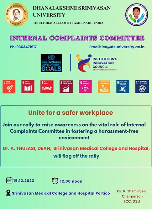 The Internal Complaints Committee (ICC) of the university conducted a significant awareness rally on 15th December 2023, from 12 Noon to 1.30 p.m. The event aimed to promote awareness about gender equality, safety, and respect for women in the workplace. The rally witnessed enthusiastic participation from 180 students representing various schools of the university, accompanied by faculty members. The rally commenced at 12 noon at the portico of Srinivasan Medical College and Hospital. Dr. V. Thamil Selvi, Chairperson of ICC, extended a warm welcome to all participants and provided insights into the functioning of the ICC. Dr. A. Thulasi, Dean of Srinivasan Medical College and Hospital, officially flagged off the rally at 12.05 p.m. The rally proceeded through different blocks of the university, covering medical, hospital, engineering, law, paramedical, nursing, physiotherapy, agriculture science, and allied health science. Participants carried placards emphasizing key themes such as equality, awareness, respect, protection, raising voice, nonviolence, empowerment, unity, dignity, and safety for women in the workplace. The event coincided with lunchtime, attracting the attention of students, staff, and workers within the campus. Spectators, including visitors and workers, had the opportunity to witness the rally, increasing its visibility and impact. Dr. Oviya, a faculty member of the ICC, expressed gratitude to all participants, acknowledging their support and commitment. The event effectively promoted the message of gender equality, awareness, and a safe working environment for women within the university.