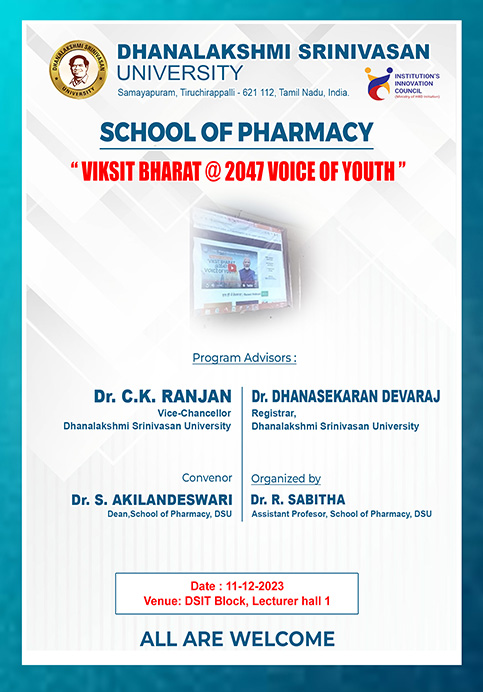 Prime Minister of India Mr.Narendra Modi addressed the youth on the occasion of "VIKSIT BHARAT @ 2047 VOICE OF YOUTH" on December 11, 2023. Encouraging active participation, he emphasized the pivotal role of the youth in shaping India's future. Modi highlighted government initiatives, urging the youth to contribute their ideas and efforts towards building a developed, inclusive, and sustainable India by 2047. The event was organized by Dr.R.Sabitha, Assistant professor, School of Pharmacy, Dhanalakshmi Srinivasan University, Trichy.