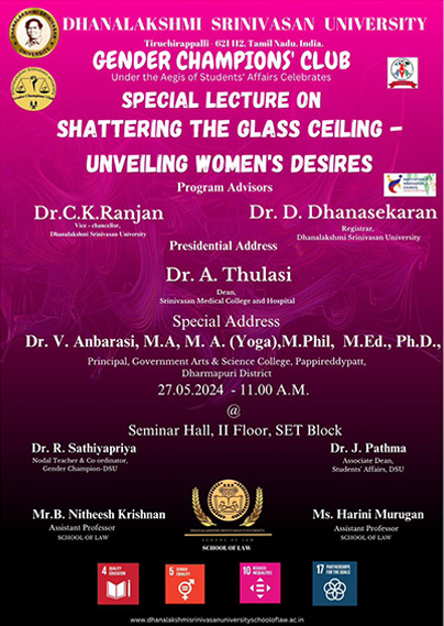Our Dhanalakshmi Srinivasan University, School of Law in Association with Gender Champions Club (under the aegis of Students Affairs) conducted a Special Lecture on "Shattering the Glass Ceiling - Unveiling Women's Desires" by Dr. V. Anbarasi, Principal, Government Arts & Science College, Pappireddypatti, Dharmapuri. The program was well-planned under the directions of our School of Law - Dean Dr. Rajkumar. The program started with the presidential Address of Dr. A. Thulasi, Dean, SMCH and Dr. J. Pathma, Associate Dean. The Welcome Address was given by Ms. Harini Murugan, Assistant Professor/ Co-ordinator - Gender Club. The Deans of Various Schools, Faculty Members, Non- Academic Members and students from every school witnessed the Programme. The Programme was successfully organised and completed by the coordinators and the student volunteers. The Guest was honoured by Dr.Sathyapriya, Nodal Teacher- Gender Club. Finally the Vote of thanks was given by Mr. B. Nitheesh Krishnan, Assistant Professor/ Coordinator- Gender Club.
