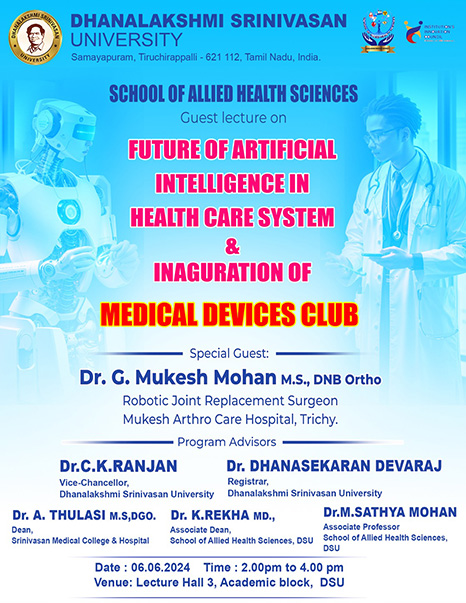 The Inauguration of "Medical Devices Club" & Guest Lecture entitled "Future of Artificial Intelligence in Health Care System" Programme was organized by School of Allied Health Sciences, Dhanalakshmi Srinivasan University, Samayapuram, Trichy, on the 06th June 2024 in the Lecture hall III 3rd Floor.