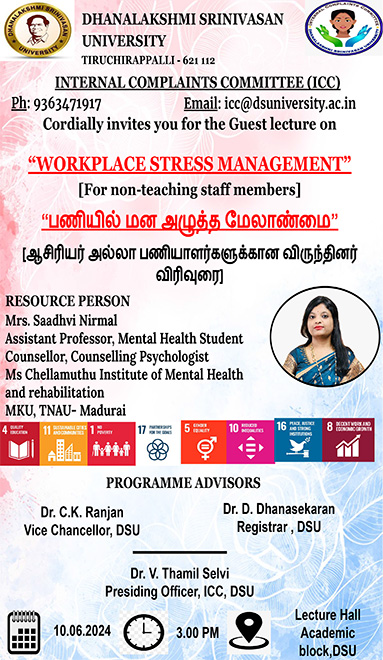 A guest lecture on “Workplace Stress Management” was conducted by ICC for non-teaching staff members of the university on 10.06.2024 at 3.00 p.m. in Dhanalakshmi Srinivasan University. 85 non-teaching staff members in the programme from various schools like Agriculture, Engineering, Management, Medicine, Allied Health Sciences, Law, Nursing and Paramedical. The chief guest Mrs. Saadhvi Nirmal, Mental Health Student Counsellor, Madurai Kamaraj University, spoke in detail by giving real time examples on the issues that people face in personal life and in workplace. Then she advocated for mindfulness techniques, time management strategies, regular physical exercise, and fostering a supportive work environment as effective means to cope with stressors. Attendees gained valuable insights into understanding, identifying, and effectively managing stress in professional settings.