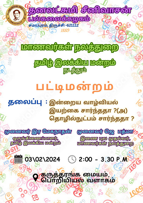 Under the ages of Students Affairs, Tamil Ilakkiya Mandram conducted a debate on 3.02.2024, entitled, "Today's lifestyle: Nature based Vs Technology based" in Seminar Hall SET building from 2 to 4.30pm. More than 200 student participants from various schools and faculties from various departments participated in this event. At the start of the event, Faculty coordinator of Tamil Ilakkiya Mandram Dr R MEGANATHAN Associate Professor of Mathematics, School of Engineering and Technology, welcome the gathering and Dr Sasikumar Guru Moorthy, Associate Dean - CSE School of Engineering and Technology, felicitate the occasion. Then the debate is successfully completed under the leadership of Dr Parthasarathy Nanjundan Associate Professor of Mathematics. Finally, the book prizes were distributed to the best speakers. The entire program was coordinated by Dr R MEGANATHAN and by the office bearers of Tamil Ilakkiya Mandram of DSU. Thank you.
