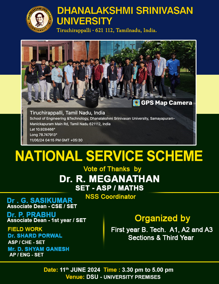 NSS Unit of School of Engineering and Technology has organized a campus cleaning activity on 11th June 2024 from 3.30 pm to 5.00 pm in our University premises. Dr G Sasikumar, Associate Dean/CSE-SET, gave the inaugural address and share the importance of NSS and its activities. Later, Dr P Prabhu, Associate Dean/ First Year-SET, felicitate the gathering by adding essentials of the learning from outside the classroom environment. All the Students of First year A1, A2 and A3 sections and third year NSS student volunteers were involved in the campus cleaning activities. During the activity, students actively participated in cleaning the campus by removing dry wastes like plastic wrappers, cups, water bottles and other disposables wastes in our DSU campus. All the wastage was collected in the garbage bag and handed over to maintenance in charge of DSU for safe disposal. Dr Shard Porwal ASP/Che and Mr D Shyam Ganesh AP/Eng were also accompanying the students during the activity. The program was ended with a vote of thanks by Dr R Meganathan, NSS Coordinator - SET, Prof/ Mathematics.