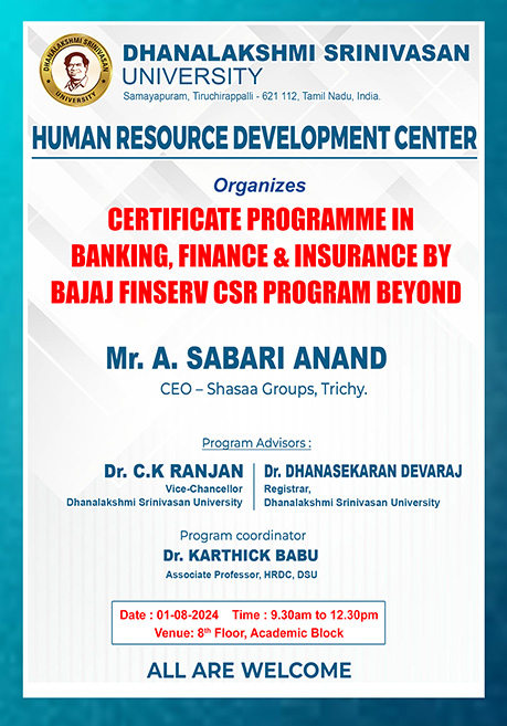 An Orientation Programme on "Certificate Programme in Banking, Finance & Insurance by Bajaj Finserv CSR Program BEYOND" in collaboration with Shasaa Groups was conducted for the students of Second year MBA on 01-08-2024 @ 8th Floor, Academic Block from 09.30 a.m. to 12.30 p.m. Mr. A. Sabari Anand, CEO – Shasaa Groups, Trichy acted as a resource person and he started with the introduction on Certificate Programme in Banking, Finance & Insurance.