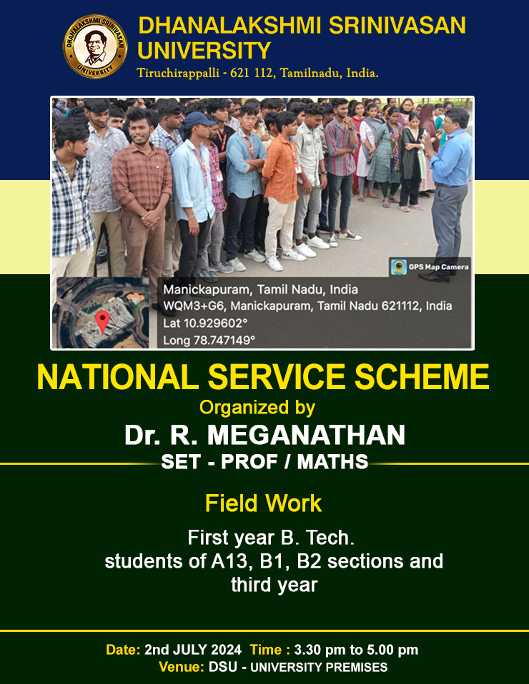 NSS Unit of School of Engineering and Technology has organized a campus cleaning activity on 2nd July 2024 from 3.30 pm to 5.00 pm in the University premises. NSS Coordinator, Dr R Meganathan, Professor, Department of Mathematics - SET, address the gathering and insisted the students about the importance of keeping our environment clean which provides a very healthy society to the future generation people. Even though NSS activities are in the curriculum, he encouraged the students to take part in the social activities like NSS and insisted the students to follow the same in their home and living environments. All the Students of First year B. Tech. A13, B1 and B2 sections and third year NSS student volunteers were involved in the campus cleaning activities. During the activity, students actively participated in the field work by doing administration of guard maintenance for protecting the coconut trees near the SET building and student’s canteen cleaning the campus by removing dry wastes like plastic wrappers, cups, water bottles and other disposables wastes in our DSU campus. All the wastage was collected in the garbage bag and handed over to maintenance in charge of DSU for safe disposal. The program ended with a vote of thanks by Dr R Meganathan, NSS Coordinator - SET, Prof/ Mathematics.