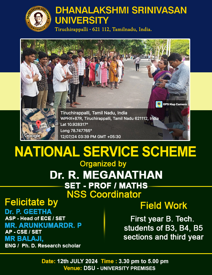 NSS Unit of School of Engineering and Technology has organized a campus cleaning activity on 12th July 2024 from 3.30 pm to 5.00 pm in the University premises. Dr P Geetha Associate Professor and Head of ECE, School of Engineering and Technology, address the gathering and insisted the students about the importance of keeping our environment clean which provides a very healthy society to the future generation people. Further, she encouraged the students to take part in the social activities like NSS and insisted the students to follow the same in their home and living environments. All the Students of First year B. Tech. B3, B4 and B5 sections and NSS student volunteers were involved in the campus cleaning activities. During the activity, students actively participated in the field work by doing administration of guard maintenance for protecting the coconut trees near the SET building and cleaning the campus by removing dry wastes like plastic wrappers, cups, water bottles and other disposables wastes in our DSU campus. All the wastage was collected in the garbage bag and handed over to maintenance in charge of DSU for safe disposal. Mr Arunkumar AP/CSE and Mr Balaji, English Ph. D. Research scholar was accompanying with the students. The program ended with a vote of thanks by Dr R Meganathan, NSS Coordinator - SET, Prof/Mathematics.