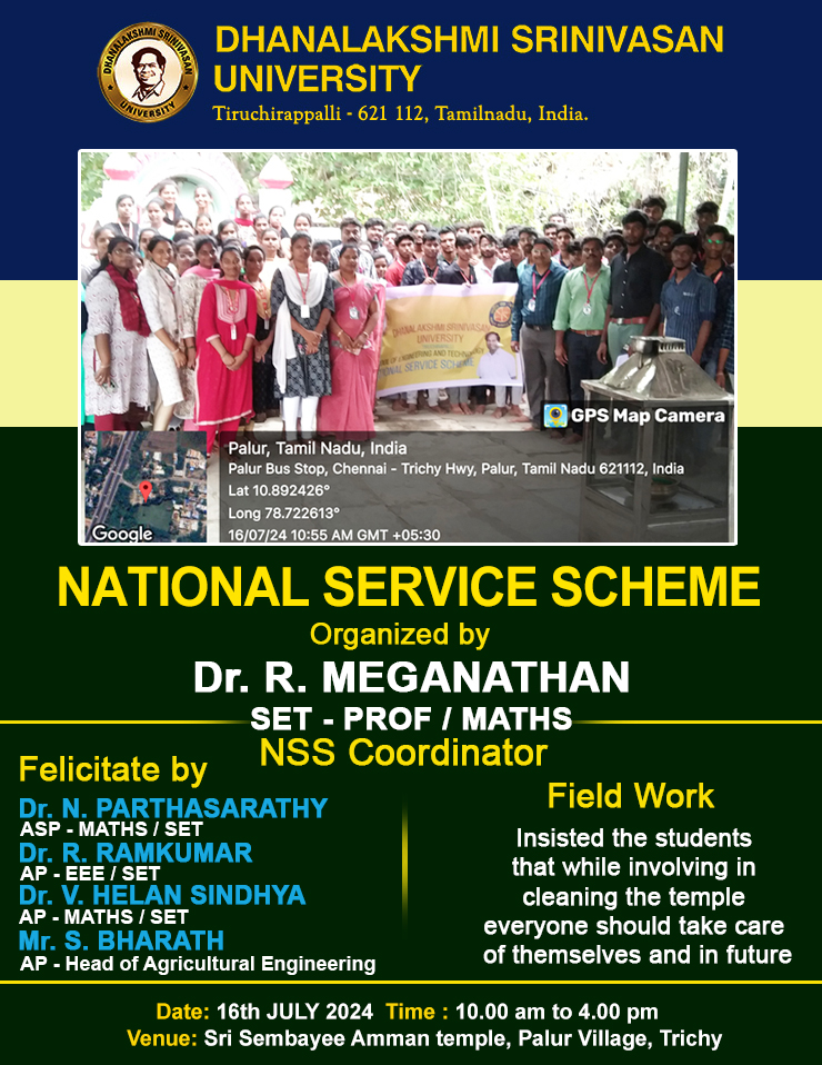 The students of NSS Unit of School of Engineering and Technology have cleaned the Sri Sembayee Amman temple, Palur Village, Trichy on 16th July 2024 from 10.00 am to 4.00 pm. Dr. G. Sasikumar, Associate Dean/CSE, School of Engineering and Technology, Dhanalakshmi Srinivasan University, Trichy, felicitated the gathering and insisted the students that while involving in cleaning the temple, everyone should take care of themselves and in future, the students must do the similar activities which is useful to the society. During the activity, Dr. N. Parthasarathy, Associate Professor of Mathematics, Dr. R. Ramkumar, Assistant Professor of EEE, Dr. V. Helan Sindhya, Assistant Professor of Mathematics, and Mr. S. Bharath, Assistant Professor and Head of Agricultural Engineering, School of Engineering and Technology were accompanying the students and guided the students to do the temple cleaning activity safely. NSS Coordinator of School of Engineering and Technology, Dr. R. Meganathan, Professor, Department of Mathematics, organized the activity.