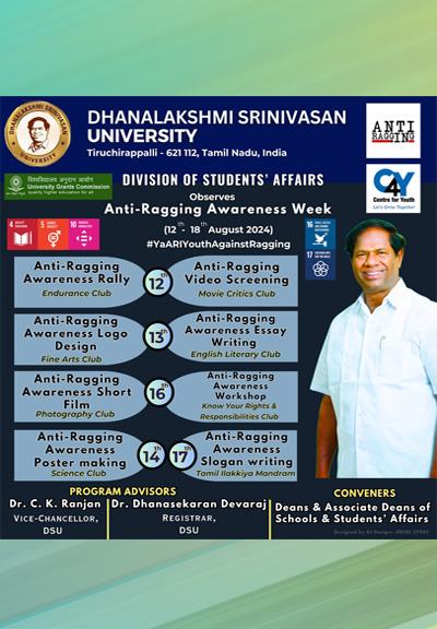 Dhanalakshmi Srinivasan University (DSU) Samayapuram, Tiruchirappalli organized “Anti-Ragging Awareness Rally" on 12/08/2024 as a part of "Anti Ragging Awareness Week (Aug 12th to Aug 18th)" campaign by University Grants Commission.