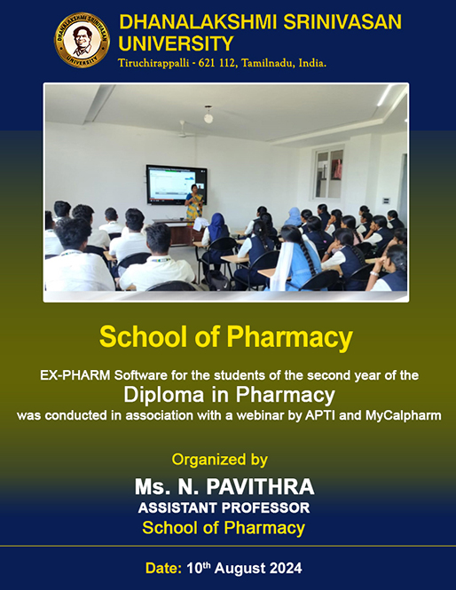 Orientation to the "EX-PHARM Software" for the students of the second year of the Diploma in Pharmacy was conducted in association with a webinar by APTI and MyCalpharm. This event helps students adapt to the simulation experiments in pharmacology. It was organized by Ms. N. Pavithra, Assistant Professor, School of Pharmacy.