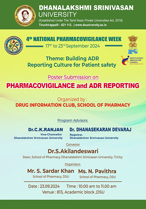 The School of Pharmacy, Dhanalakshmi Srinivasan University hosted a significant “POSTER PRESENTATION” event for the 4th National Pharmacovigilance Week - September 17th - 23rd, 2024 under the aegis of "Drug Information Club" on September 23, 2024, at 813, Academic block, DSU. Students from the Diploma in Pharmacy presented their ideas on Pharmacovigilance and ADR Reporting Poster Presentations. Dr. S. Brito Raj and Prof. Rajeshwari evaluated the posters. Dr. S. Akilandeswari, Dean of School of Pharmacy encouraged and congratulated all the student participants for their efforts. This approach likely allowed for sharing the importance of ADR reporting and ensuring patient safety. The program successfully achieved its goal of promoting awareness and fostering discussions on Pharmacovigilance and ADR reporting. Participants gained valuable insights into innovative approaches for preventing medication errors and vigilance reporting with proactive measures. The event was organised and completed by Mr. S. Sardar Khan and Ms. Pavithra, Assistant Professor, School of Pharmacy, DSU.