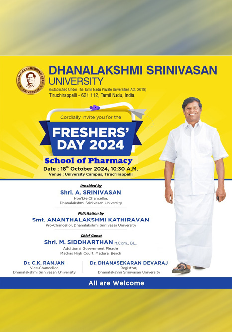 The School of Pharmacy at Dhanalakshmi Srinivasan University, Trichy, recently conducted a vibrant Orientation Programme for the fresher students, welcoming the newest members of the university with warmth and excitement. The event, held on 18.10.2024, was designed to help the new students transition smoothly into their academic journey, introducing them to the rich culture, opportunities, and expectations at DSU.