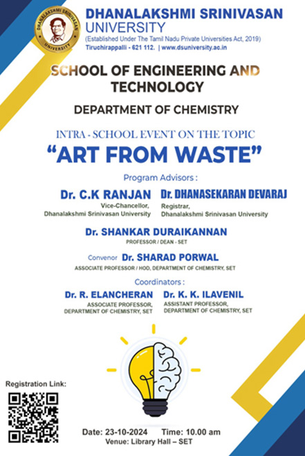 The "Art from Waste" event was held on Wednesday, 23rd October 2024 in the Seminar Hall (Library Hall-SET), beginning at 10:00 AM with a prayer song. The welcome address was delivered by Dr. R. Elancheran, Associate Professor of Chemistry, followed by felicitation from Dr. Sharad Porwal, Head of the Chemistry Department. The Dean, Dr. Shankar Duraikannan, shared valuable insights on sustainability, recycling, and the importance of Sustainable Development Goals (SDGs) during his address.