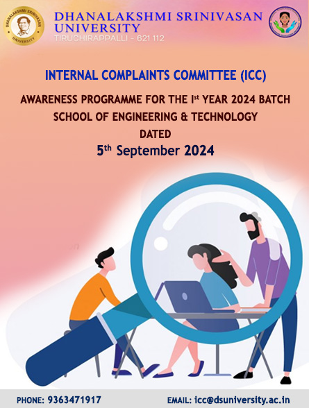 An awareness session on Internal Complaints Committee (ICC) was conducted by Dr. V. Thamil Selvi on 05.09.2024 at Seminar Hall, SET, from 10.00 am to 10.30 pm for the First-year School of Engineering and Technology students in their induction programme. Around 270 students attended the session from B10, B11, B12, and B13 classes. The speaker gave a clear picture on what ICC is, it's functioning, complaining process, redressal, plans, rights of the citizen in India, and women's rights through Power Point Presentation. She also motivated the students to come forward to give a complaint in case of any issues related to Sexual Harassment.