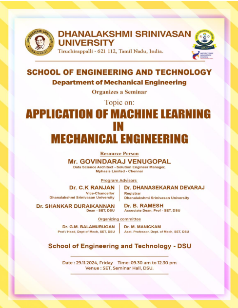 Innovation Program Organized by the Department of Mechanical Engineering A technical seminar on “Application of Machine Learning in Mechanical Engineering” was organized by the Department of Mechanical Engineering, School of Engineering& Technology, DSU on 29/11/2024 from 9.30 a.m. to 12.30 p.m at Hall no 402, SET,DSU. The resource person was Mr. Govindaraj Venugopal, Data Science Architect – Solution Engineer Manager, Mphasis Limited – Bangalore.